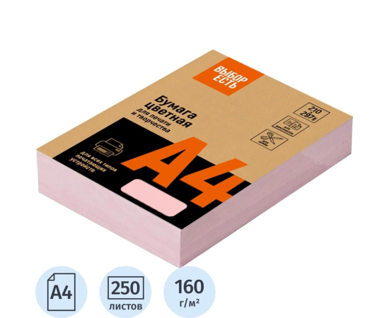 Бумага цветная (А4,160г, розовая пастель) 250л/уп 1642860