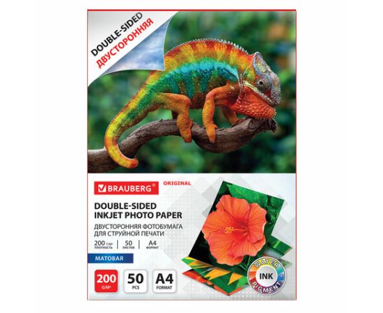 Фотобумага матовая, А4, 200 г/м2, двусторонняя, 50 листов, BRAUBERG ORIGINAL, 363989
