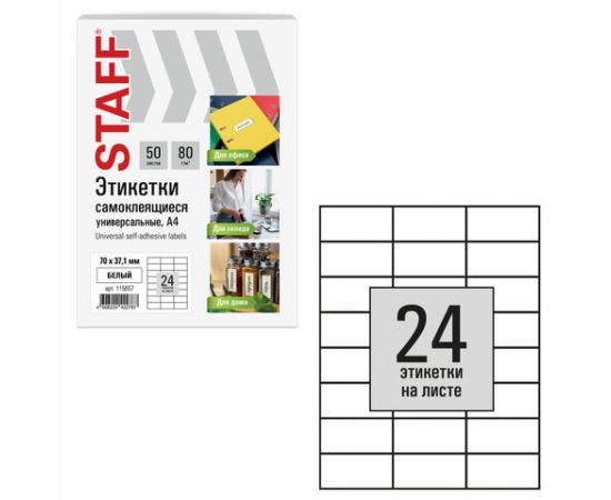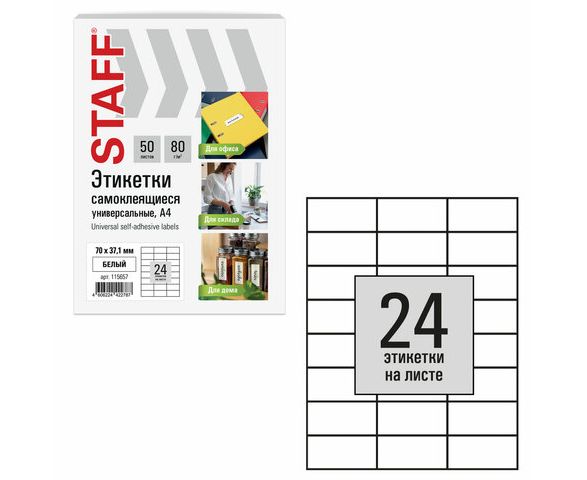 Этикетка самоклеящаяся 70х37,1 мм, 24 этикетки, белая, 80 г/м2, 50 листов, STAFF BASIC, 115657