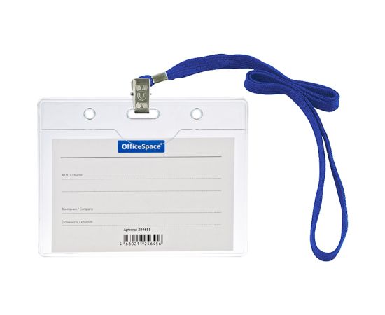 Бейдж горизонтальный OfficeSpace, 100*75мм (размер вставки 85*55мм), с клипсой на синем шну,284655