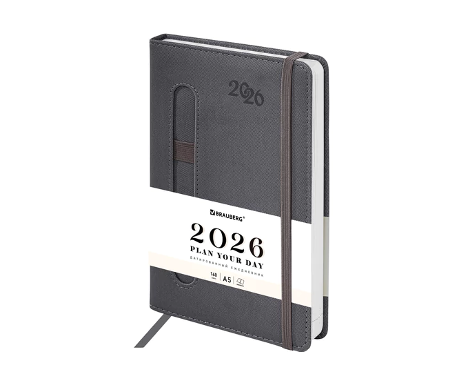 Ежедневник датированный 2026, А5, 138x213 мм, BRAUBERG "Optimal", под кожу, резинка, держатель для ручки, серый, 117469