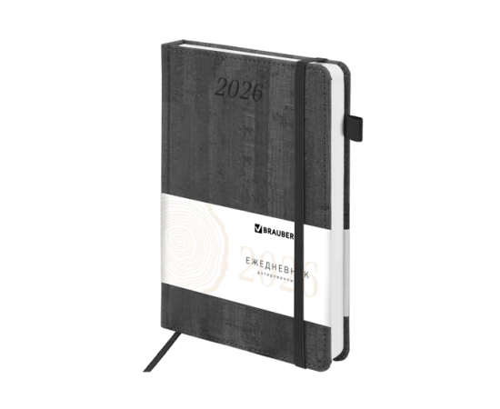 Ежедневник датированный 2026 А5 138x213 мм, BRAUBERG "Wood", под кожу, держатель для ручки, серый, 117108