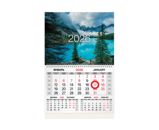 Календарь квартальный 2026 г., 1 блок, 1 гребень, магнитный курсор, мелованная бумага, BRAUBERG, "Горное озеро", 116921