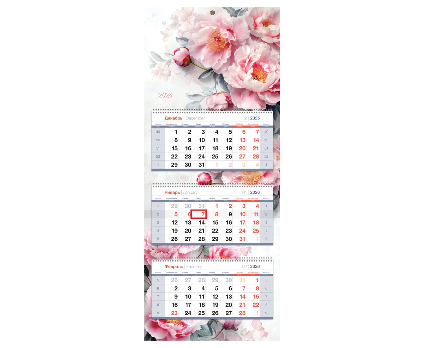 Календарь квартальный 3 бл. на 3 гр., 330*810 мм BG Premium "Пионы", с бегунком, 2026г. 380973