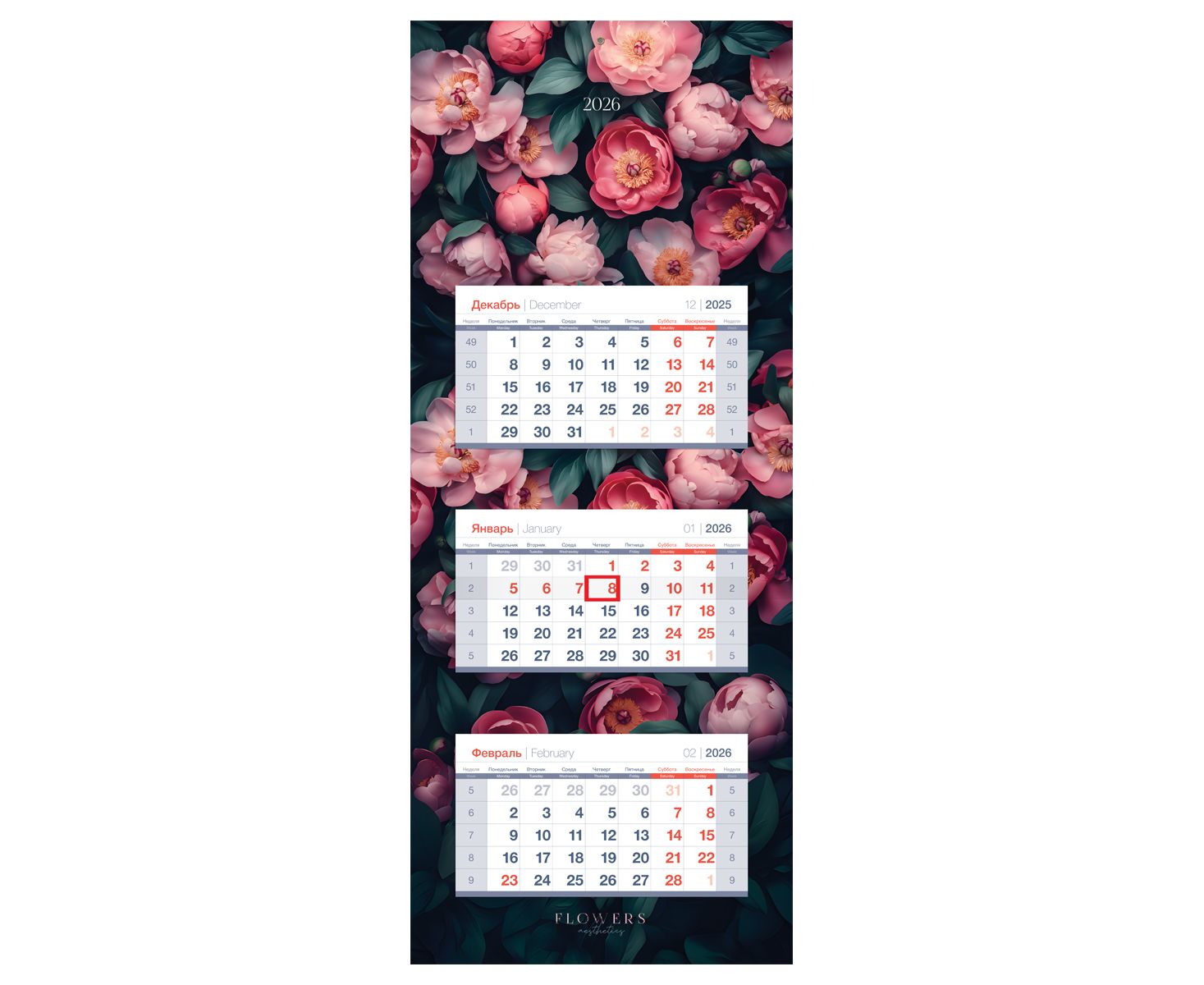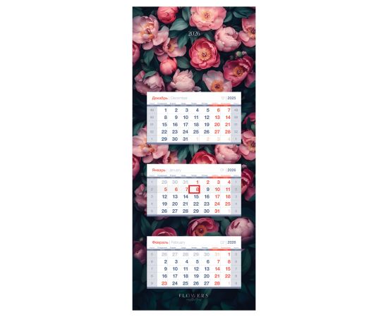 Календарь квартальный 3 бл. на склейке, 340*840 мм BG Люкс прямой "Роскошь цветов", с бегунком, 2026г., 380980