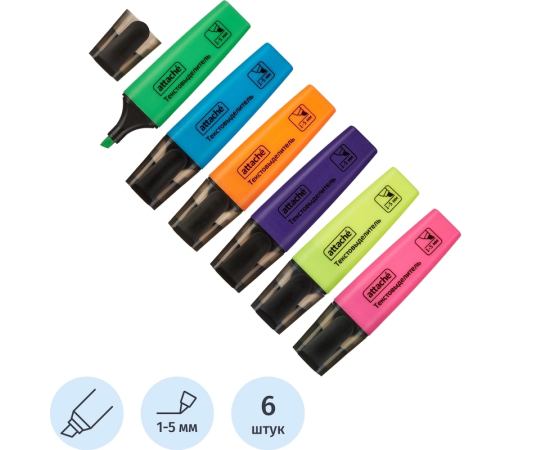 4261340723 НАБОР ТЕКСТОВЫДЕЛИТЕЛЕЙ ATTACHE COLORED 958570 1-5ММ 6ШТ ЖЕЛТЫЙ/ЗЕЛЕНЫЙ/ГОЛУБОЙ/РОЗОВЫЙ/ОРАНЖЕВЫЙ/ФИОЛЕТОВЫЙ