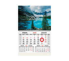 Тип календаря: квартальный на 1 гребне Год: 2026 Тип скрепления: гребень Размер: 33,5х50,3 см Внутренний блок: мелованная бумага Плотность внутреннего блока: 80 г/м2 Подложка: мелованный картон Плотность подложки: 250 г/м2 Курсор: да Пикколо: да Дизайн: Горное озеро. Календарная...