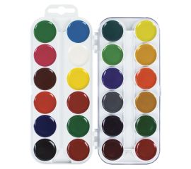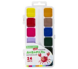 Количество цветов в наборе: 24 Добавка в основу: мед Отделение для кисточки: да Форма кюветов: круглая Упаковка: пластиковая коробка с европодвесом