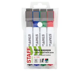 Цвет: ассорти Серия: STAFF Manager Толщина линии письма: 3 Наконечник: круглый Количество маркеров в наборе: 4 шт. Основа чернил: спиртовая Чернила стираются сухой губкой: да Не протекает при перепаде давления: да Материал корпуса: пластик