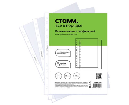 Папка-вкладыш с перфорацией (файл) СТАММ А4, 50мкм, глянцевая, ММ-31618, 368385