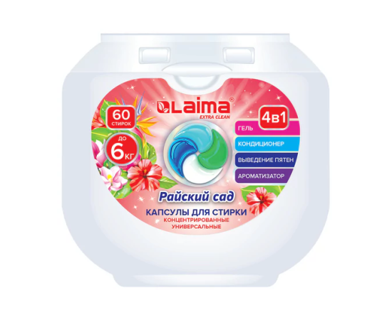 Капсулы для стирки белья большие концентрат 4 в 1, с кондиционером, "Райский сад", 60 шт., LAIMA, 608876
