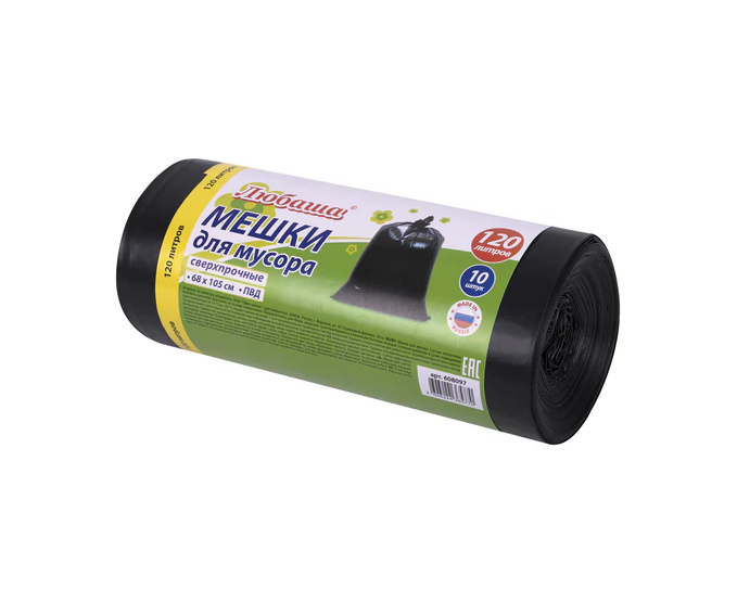 Мешки для мусора 120 л черные, в рулоне 10 шт., ПВД 55 мкм, 68х105 см, ЛЮБАША, 608097