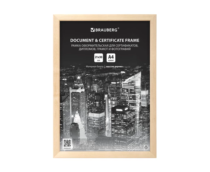 Рамка 21х30 см, дерево, багет 14 мм, BRAUBERG "Elegant", цвет натуральный, акриловый экран, 391296