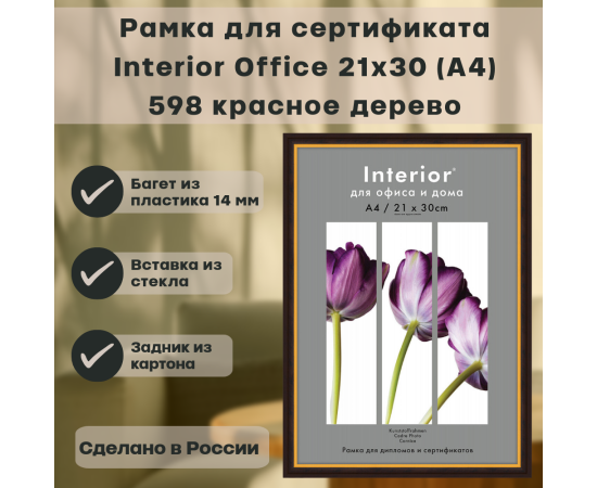 Рамка для сертификата Interior Office 21x30 (A4) 598 красное дерево, со стеклом