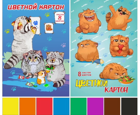 Картон цветной, А4, 8 л, 8 цв, немелованный, "Кот Манул", Lamark, 90647