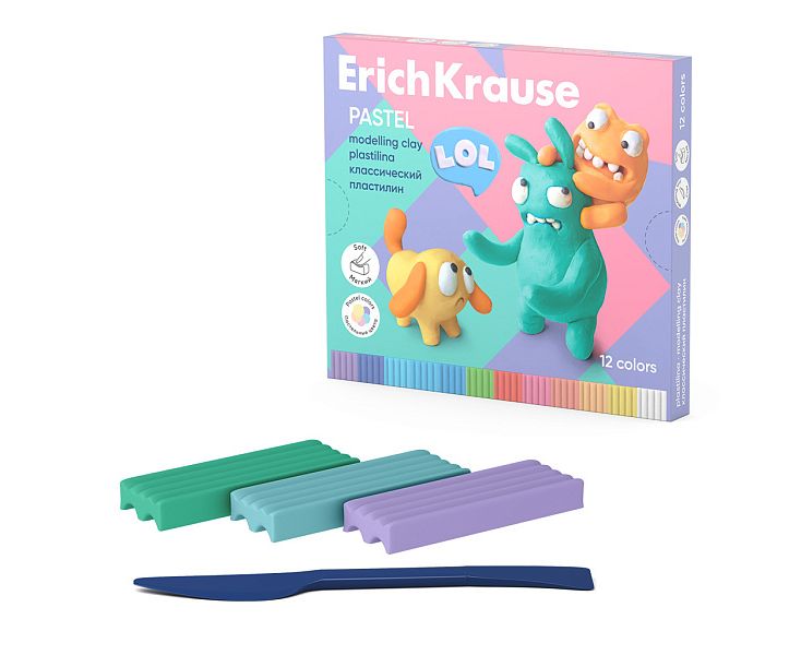 Пластилин классический ErichKrause Jolly Friends Pastel 12 цветов со стеком, 216 г (в коробке 12 шт), 61352