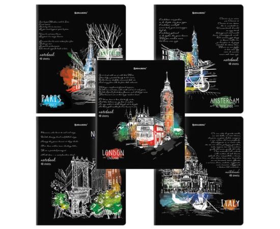 Тетрадь А5, 48 л., BRAUBERG, скоба, клетка, глянцевый лак, "Города" (микс в спайке), 404346